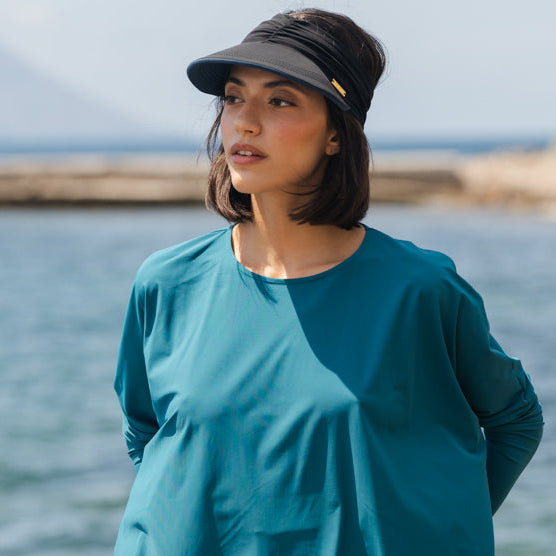 Reversible UV Visor Cap in Navy Blue and Black – offering two classic looks in one! Crafted from innovative, high-performance fabric, this visor provides comfortable, breathable protection for your face, making it ideal for sunny days at the beach, pool, or on a boat, as well as for sports and everyday outings. The visor’s design ensures a snug yet gentle fit, suitable for all head sizes and even headphone-friendly for added convenience. A stylish, practical accessory that effortlessly combines fashion with functionality, keeping you shielded from the sun without compromising on comfort.