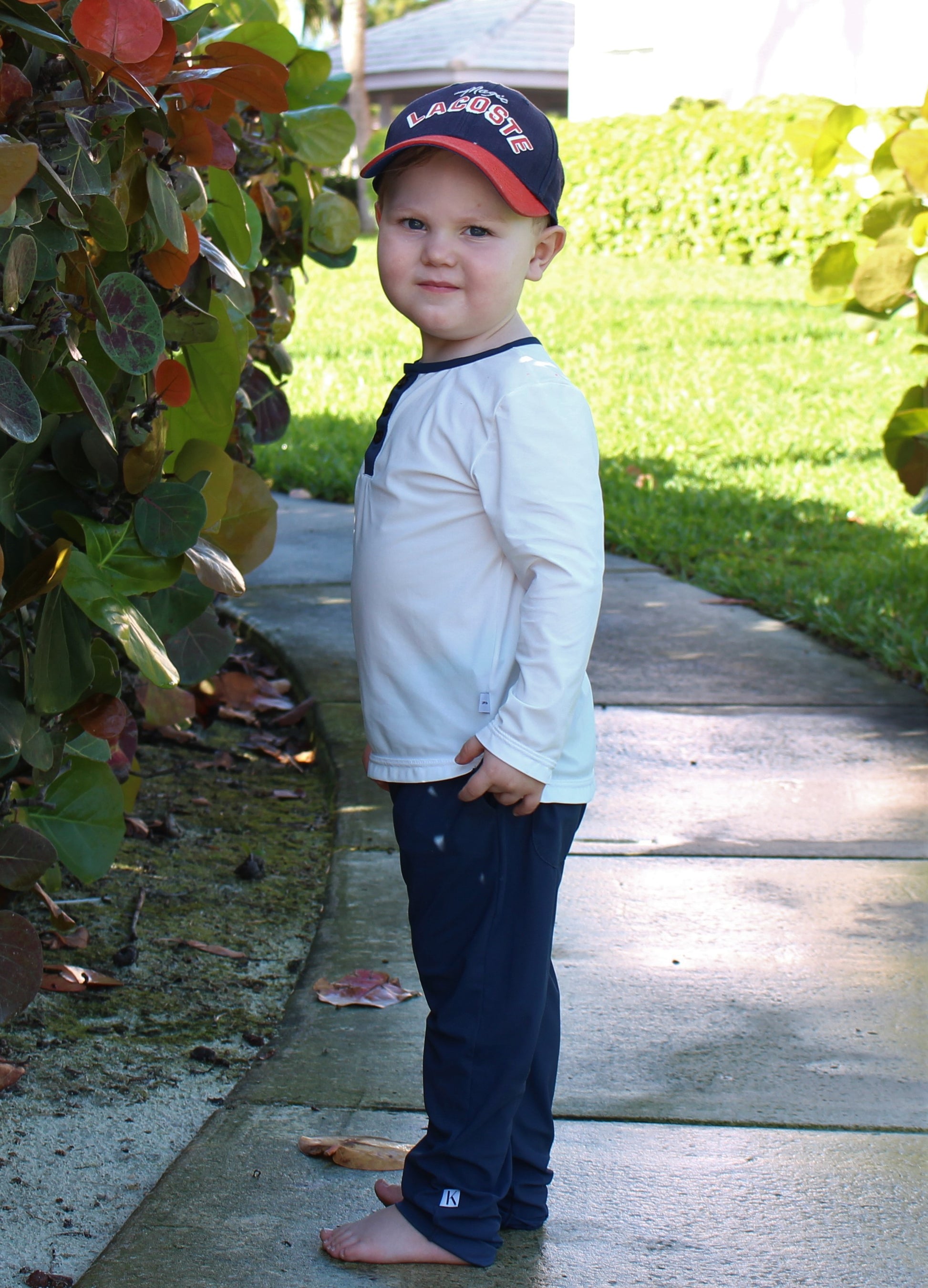 Stilfulla solskyddsbyxor med solskyddsfaktor 50+ i en härlig blå färg, som är framtagna i samråd med hudläkare. Byxorna är långa, har resår i midjan med snöring och fickor både fram och bak. Används med fördel på förskola, i lekpark och på solresan. Byxorna är gjorda av tunna italienska kvalitetstyger som garanterar att solskyddet är minst solskyddsfaktor 50+, och som även är luftiga och andas. Kalani använder bara tyger som är certifierade enligt Öko-tex Standard 100, som garanterar att tygerna inte innehåller några farliga substanser.
